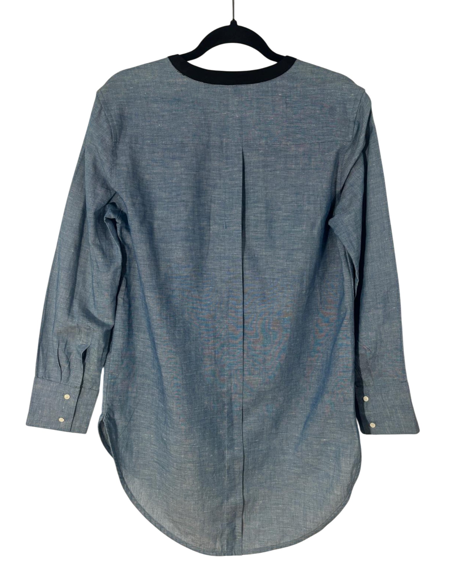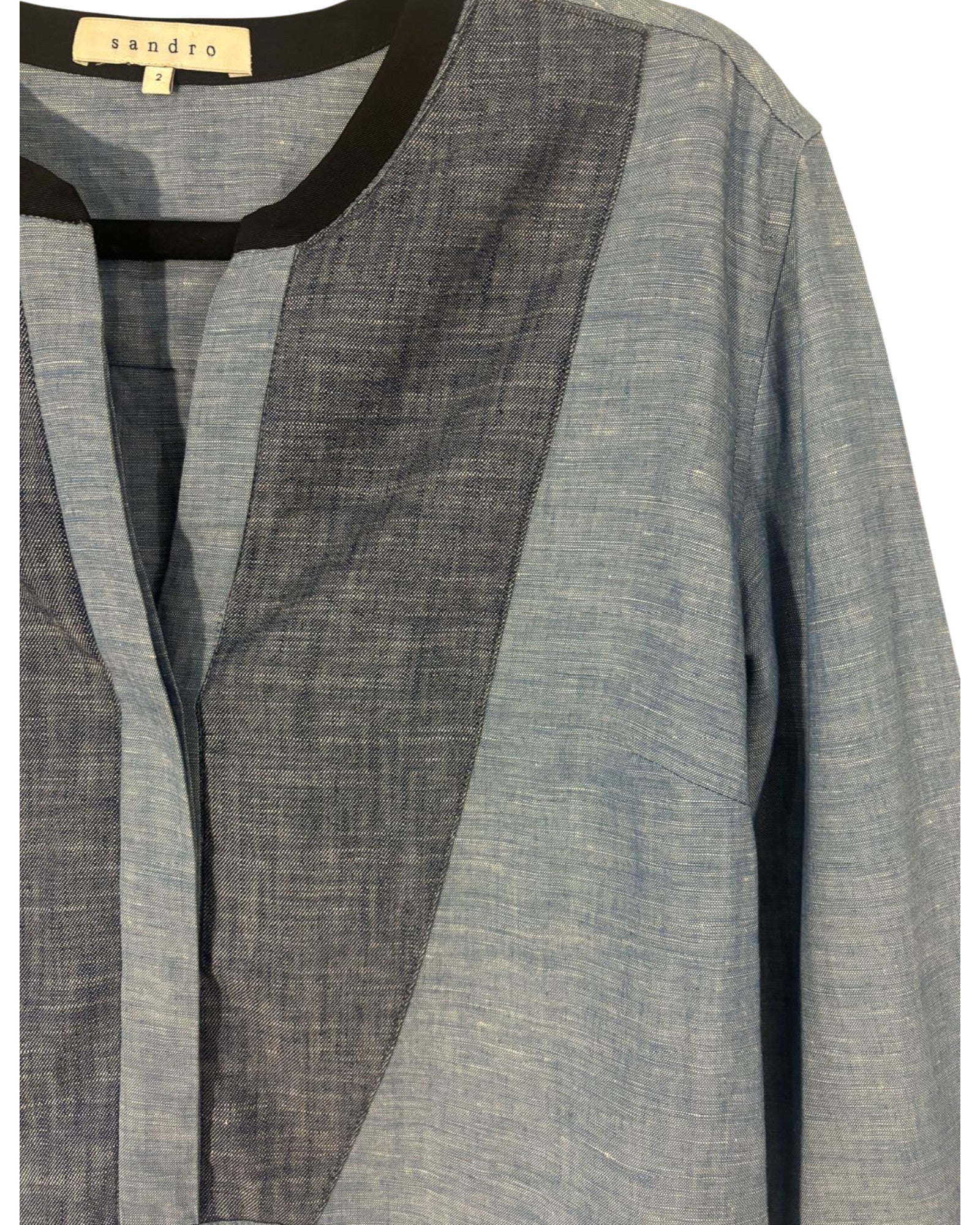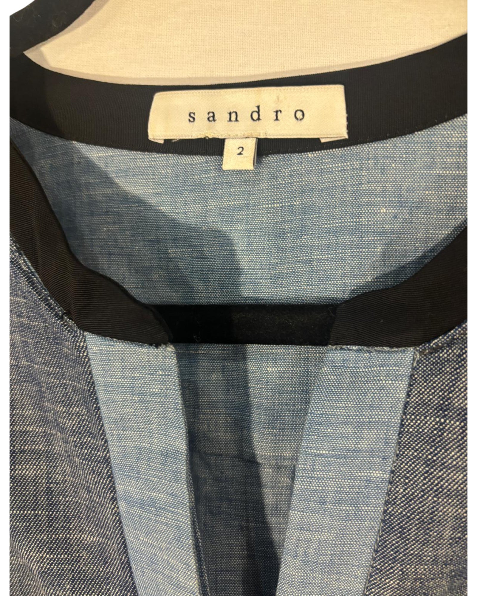 Blouse Sandro, taille 38/40, teinte bleu jean, conservée en très bon état. Un intemporel chic à ne pas manquer