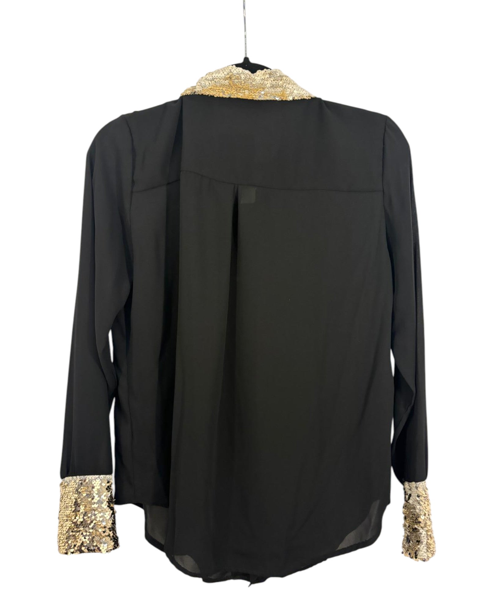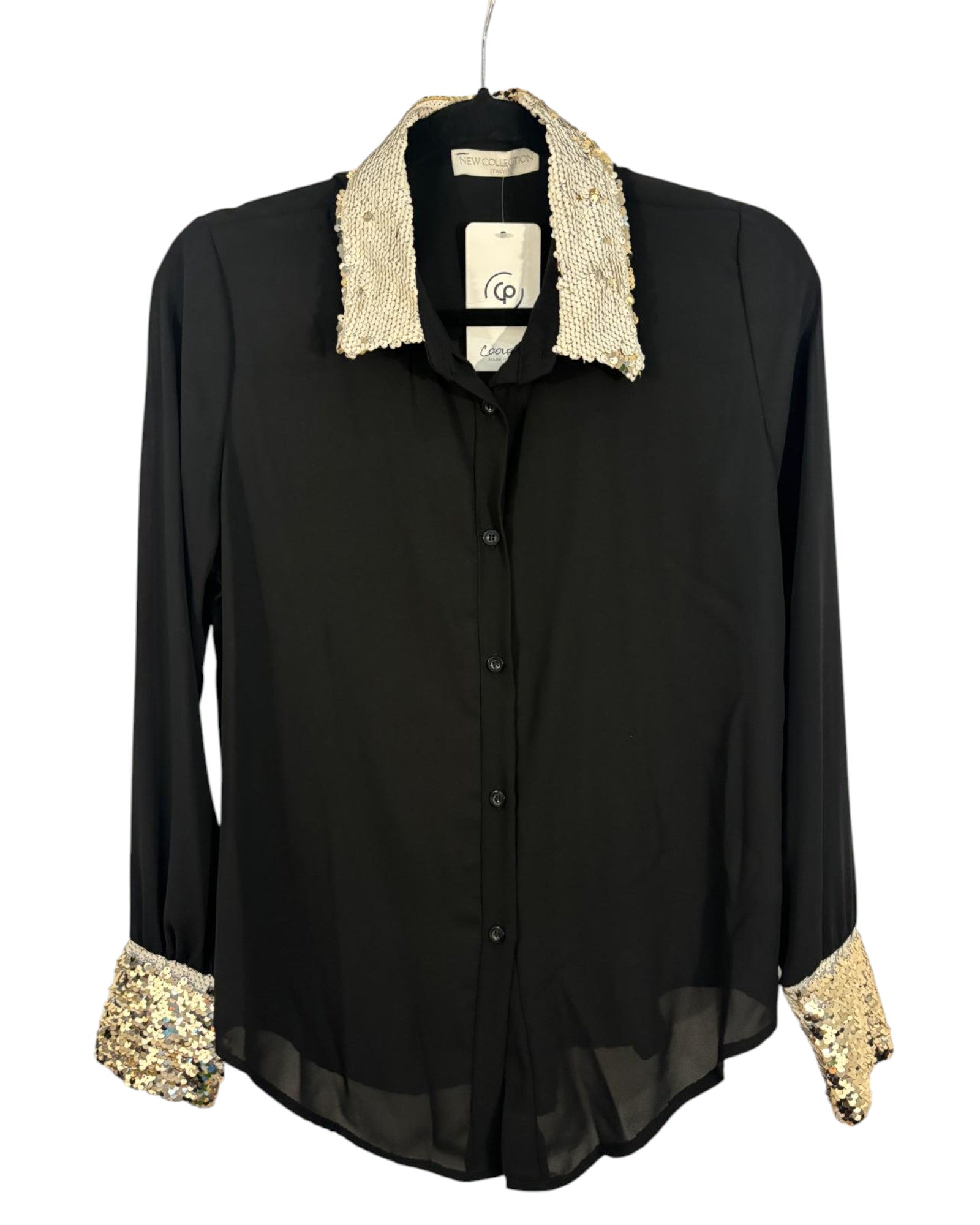 Découvrez cette chemise New Collection neuve avec étiquette, aux coloris noirs élégants et doté d’un col doré raffiné, disponible en tailles M et S. Parfaite pour rehausser votre style avec sophistication.