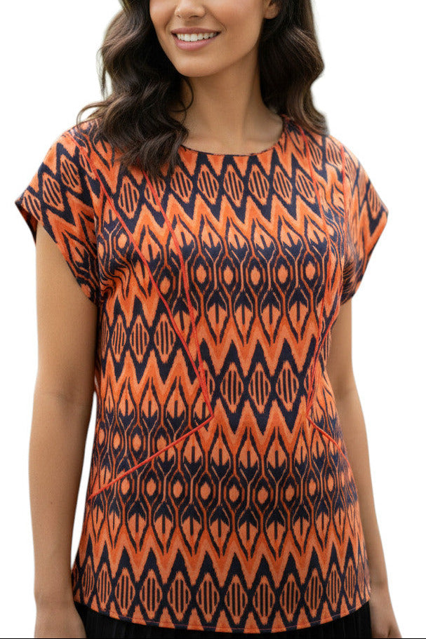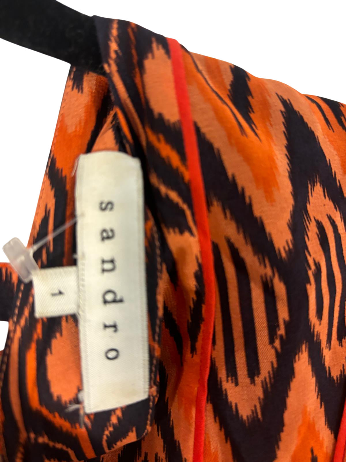Haut Sandro Taille S en coloris orange et noir, en excellent état. Un choix élégant et soigné pour enrichir votre garde-robe avec une pièce de qualité.