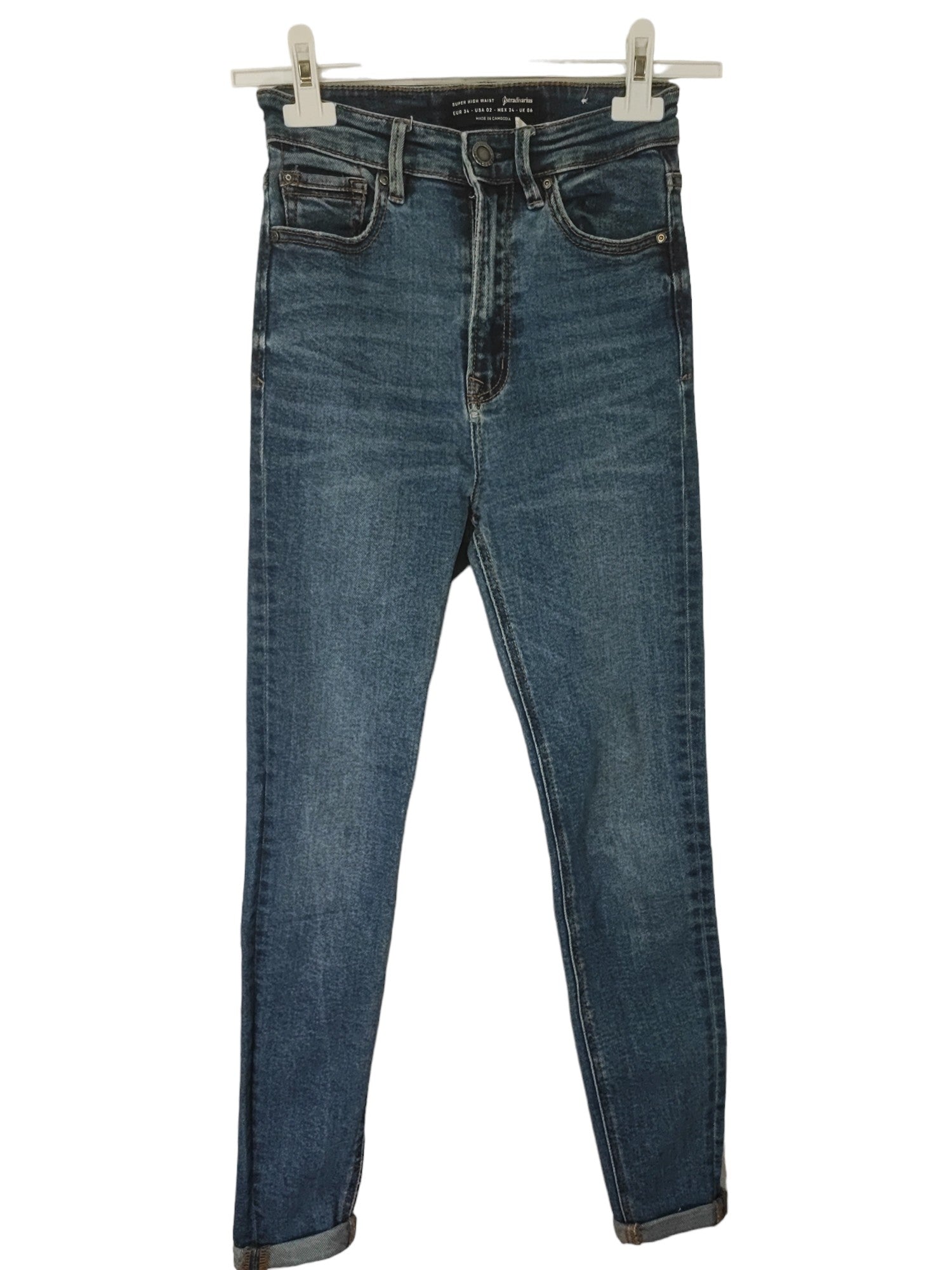 Jean Stradivarius, taille XS, en bleu raffiné, présenté en excellent état pour une allure élégante et soignée.