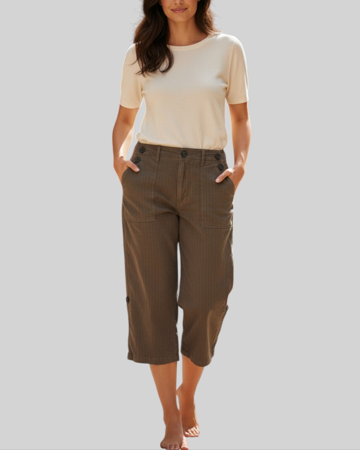 Pantacourt Comptoir des Cotonniers en taille 38, dans une teinte beige marron raffinée. Ce modèle en très bon état combine élégance et confort pour sublimer vos tenues estivales.