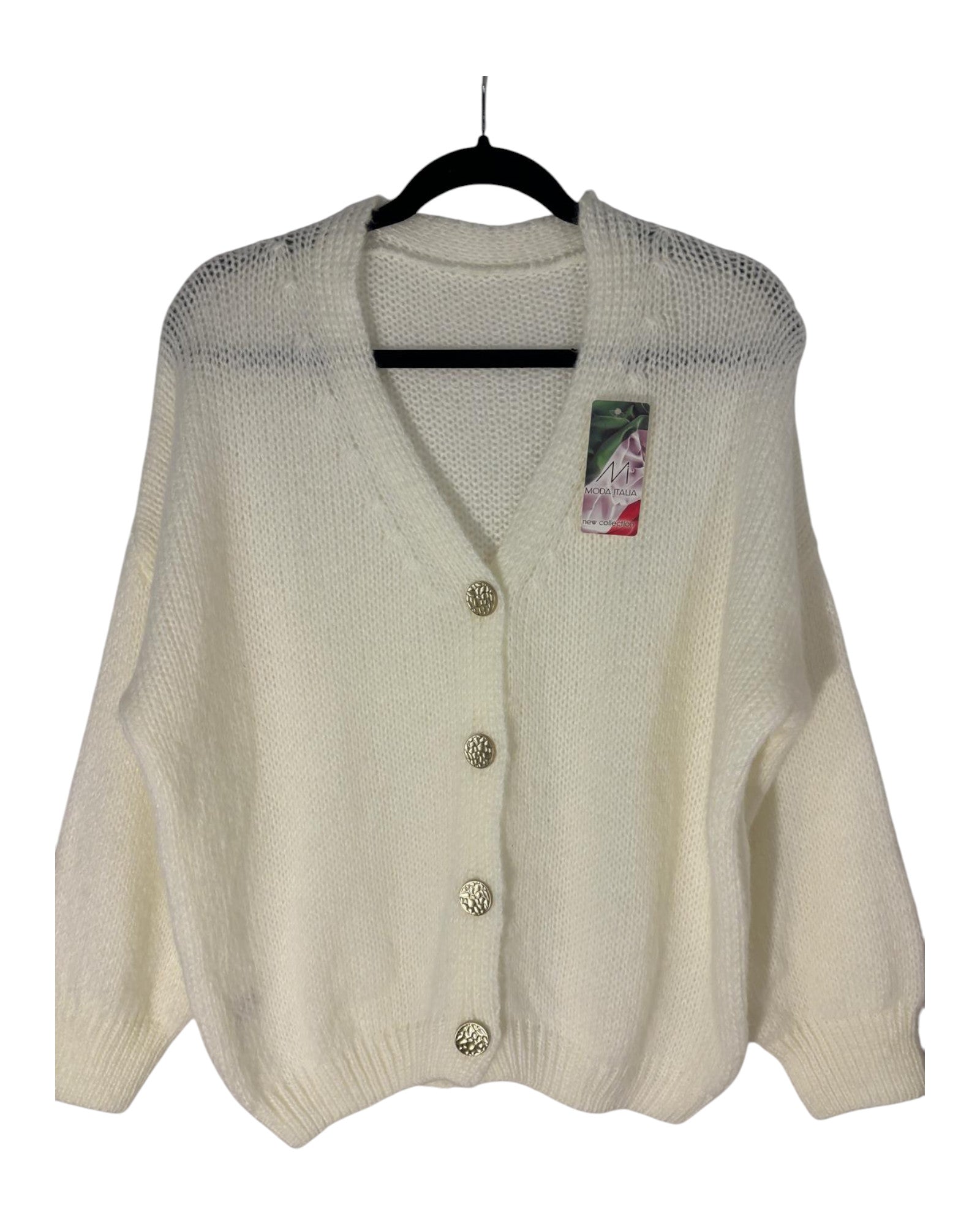 Pull boutonné Made in Italy  d’exception, taille unique, d’un blanc immaculé, neuf avec étiquette d’origine.
