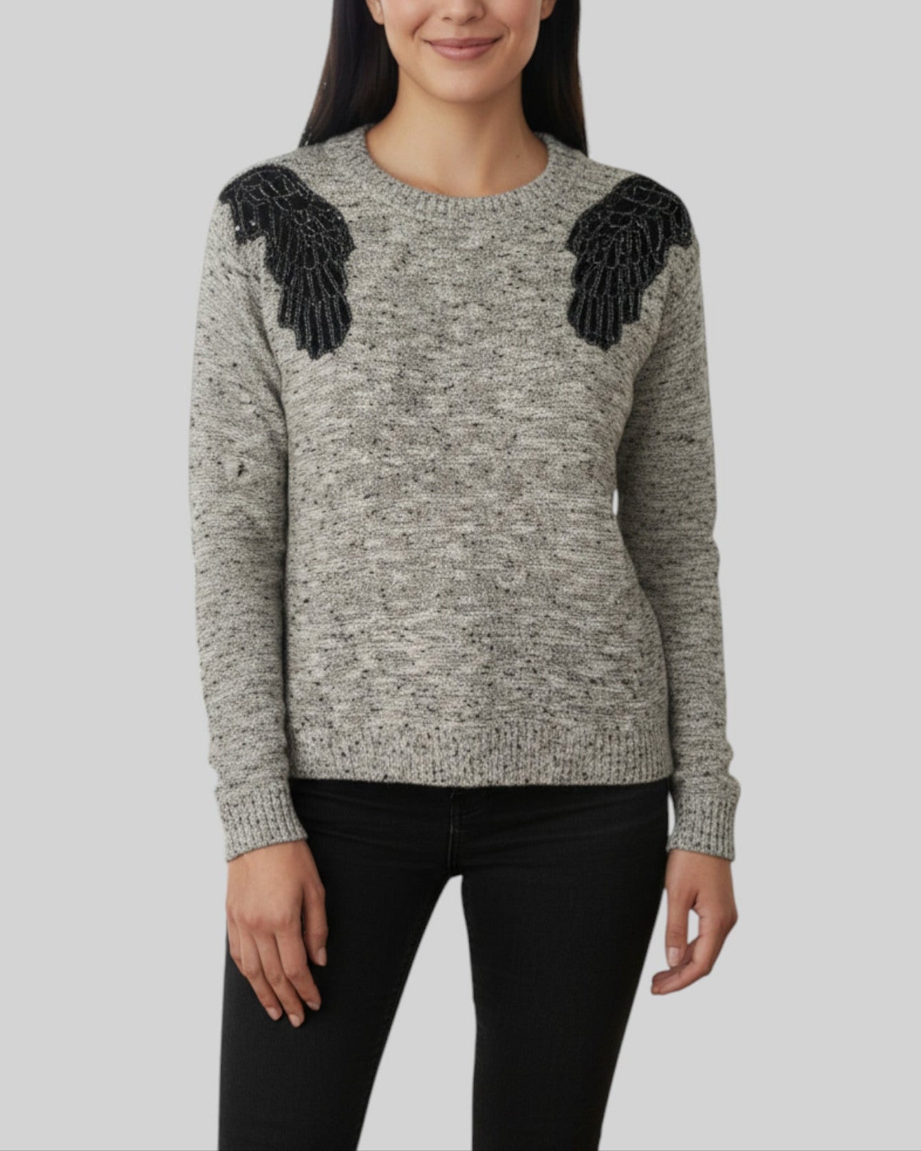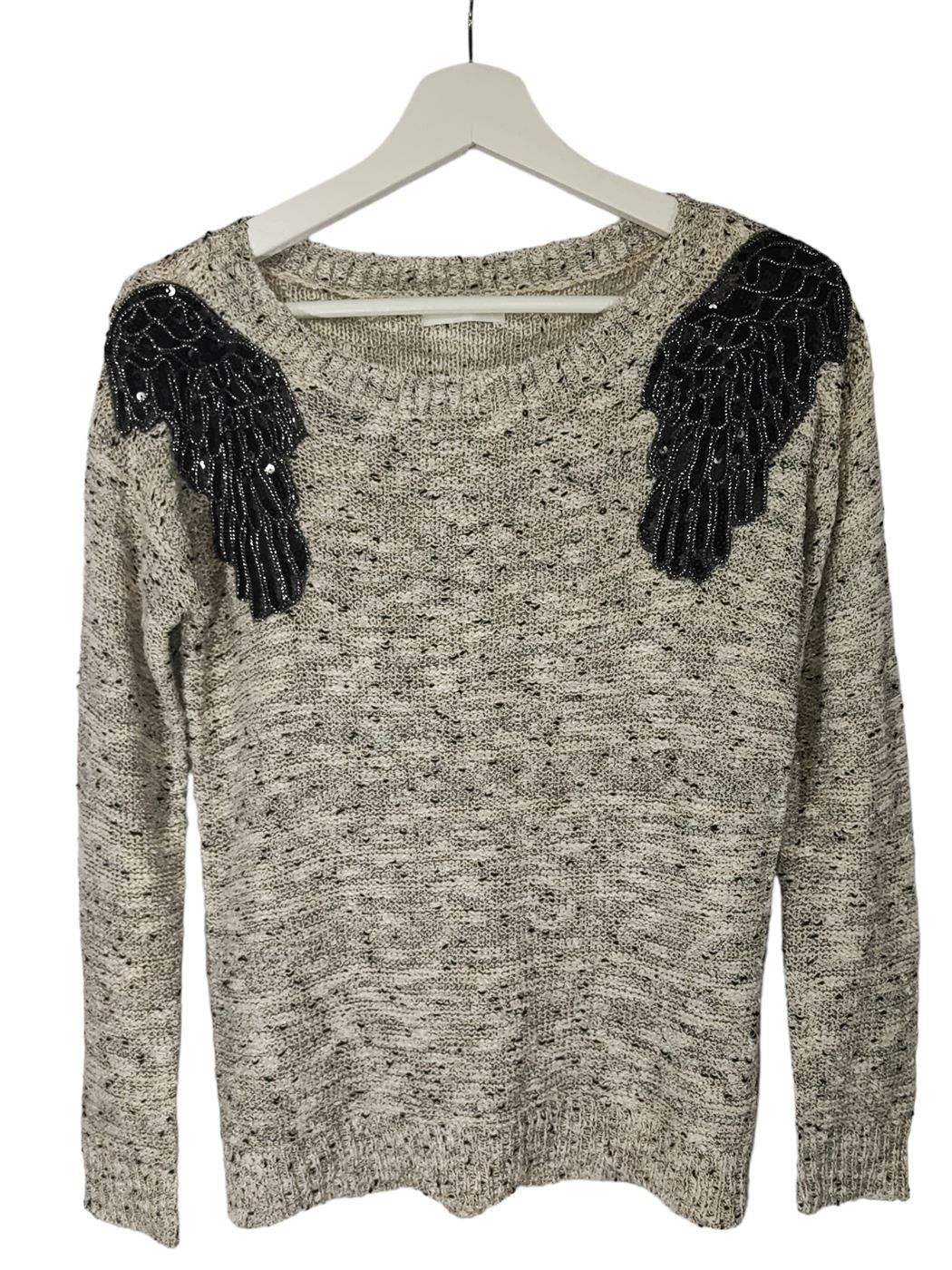 Pull chic à motif ailé de la marque Cache Cache, taille S. Sa teinte grise élégante et son excellent état en font une pièce raffinée et distinctive.