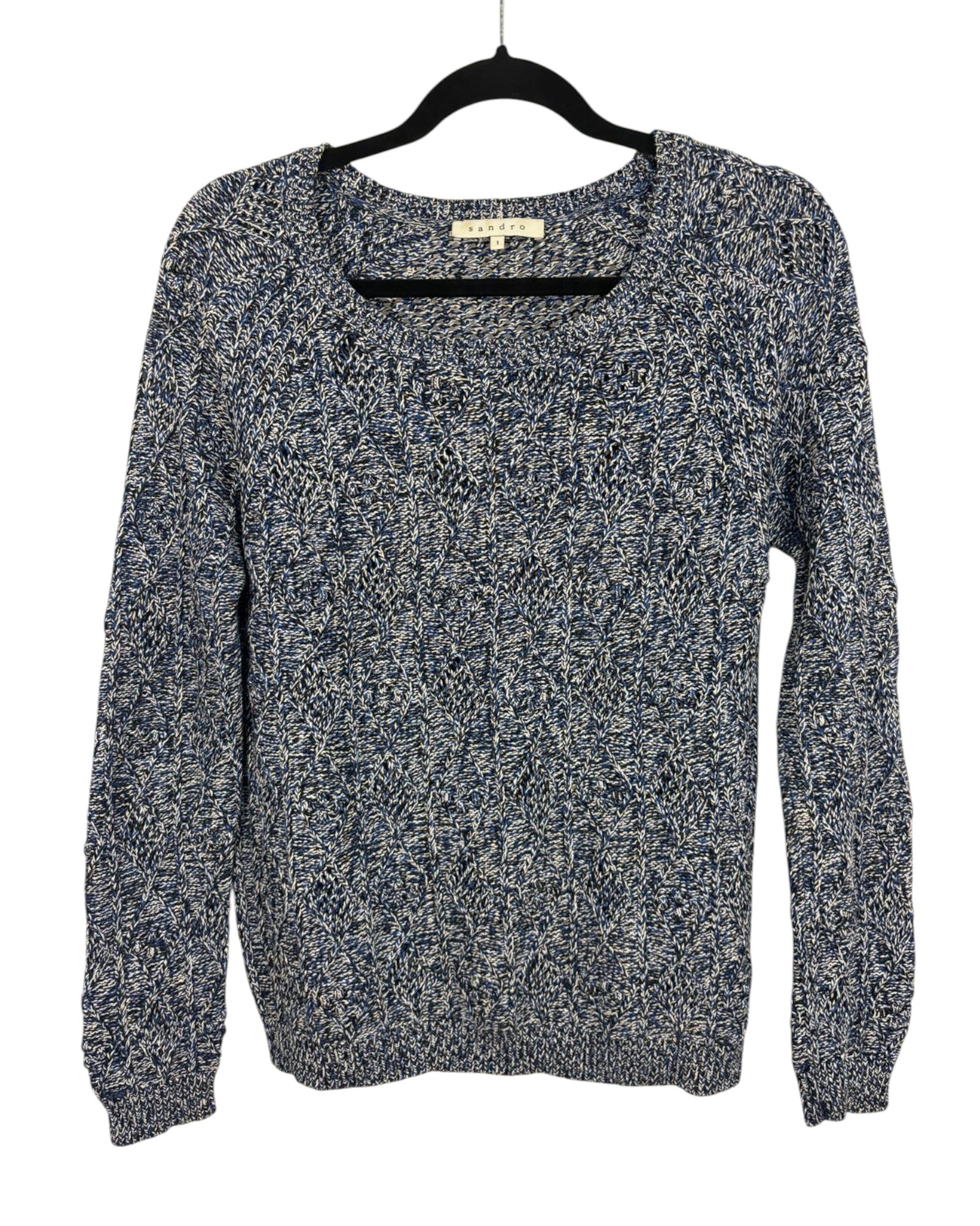Découvrez ce pull Sandro en taille 36, alliant élégance avec ses nuances de bleu, noir et blanc. Son excellent état vous assure une pièce raffinée et durable pour enrichir votre garde-robe.