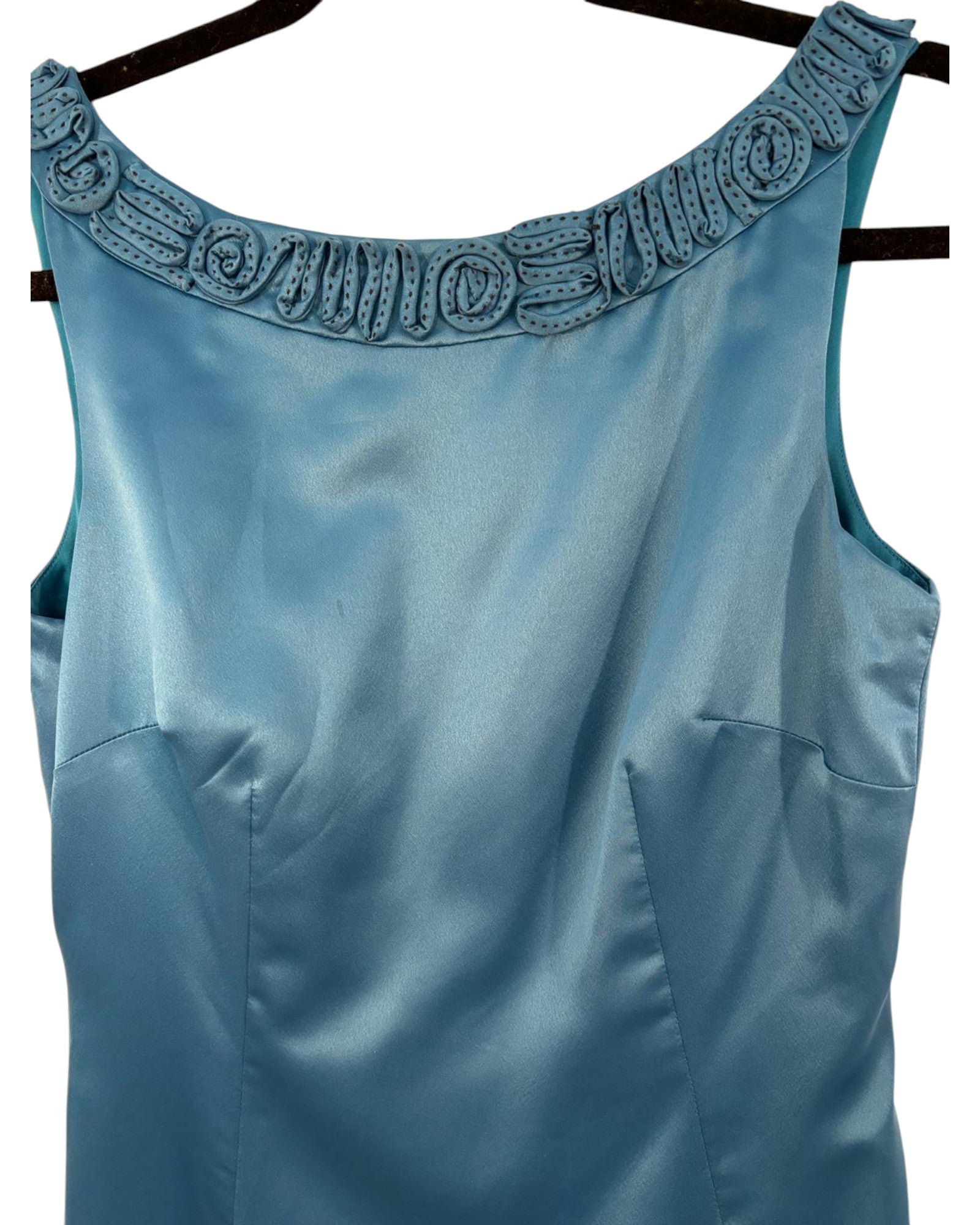 Robe en satin bleu azur signée Manoukian, en excellent état. Taille S, offrant une élégance raffinée.