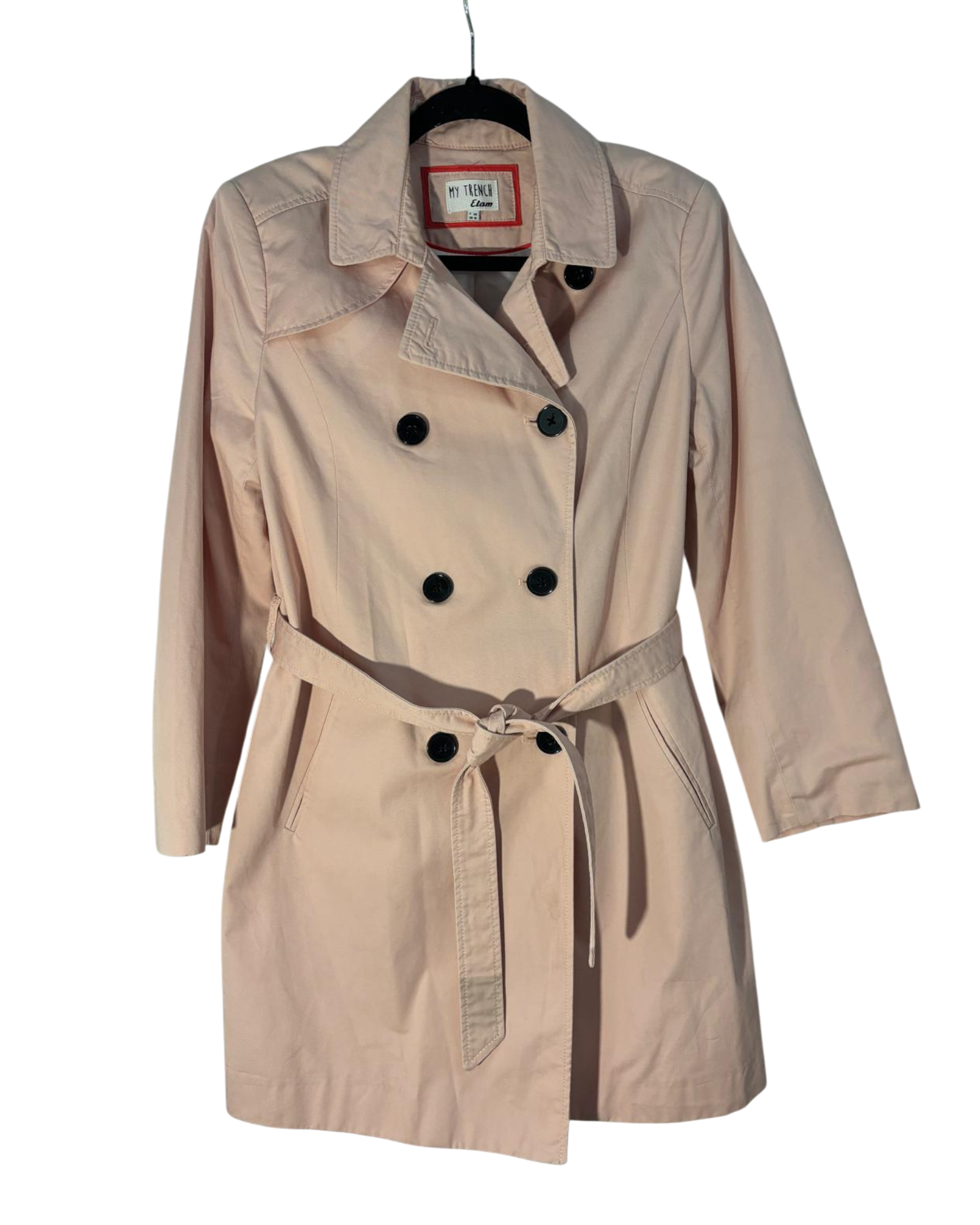 Trench Etam en taille M, teinte rose poudré, en excellent état. Un choix élégant pour compléter votre garde-robe avec style et douceur.