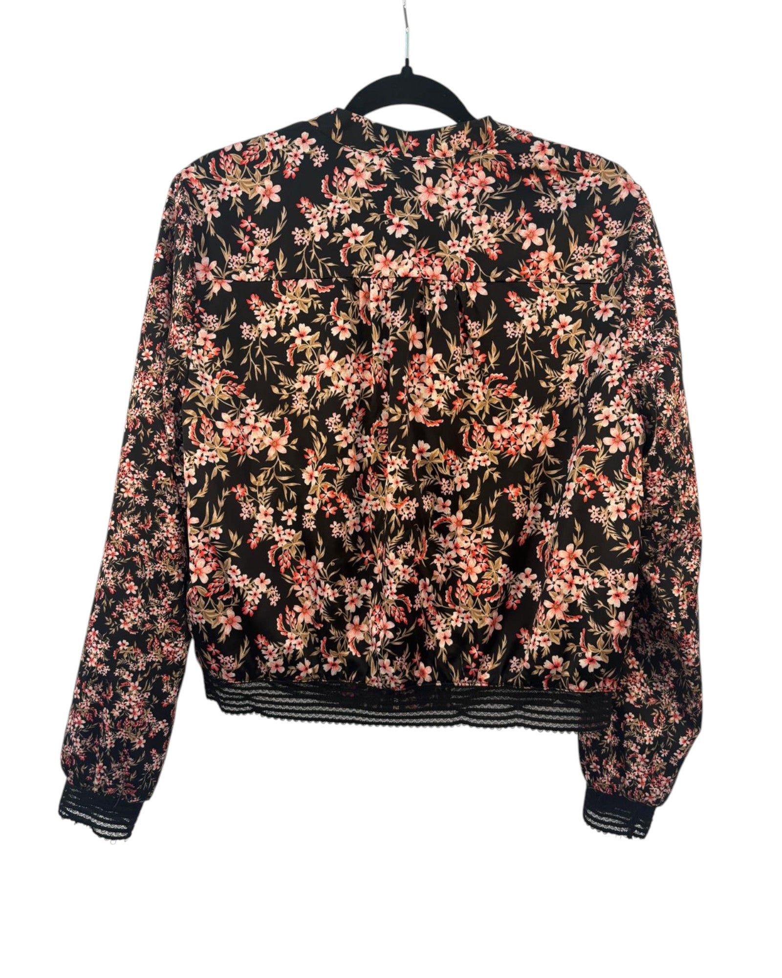 Veste bomber légère signée Camaïeu, taille 36, arborant un motif floral noir élégant. En excellent état, elle apportera une touche stylée et légère à vos tenues.